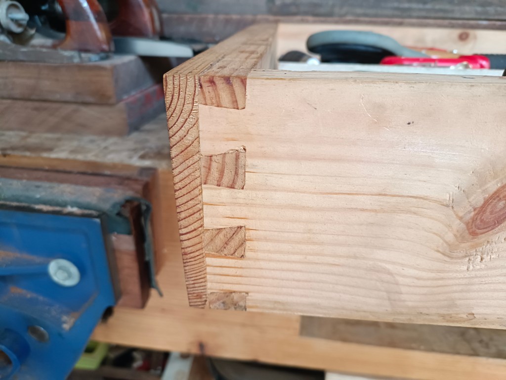 Once it fit perfectly, I cut the two side pieces and the back one, taking into account the thickness of the pieces for their measurements and I then made the dovetail joints only for the front of the drawer.