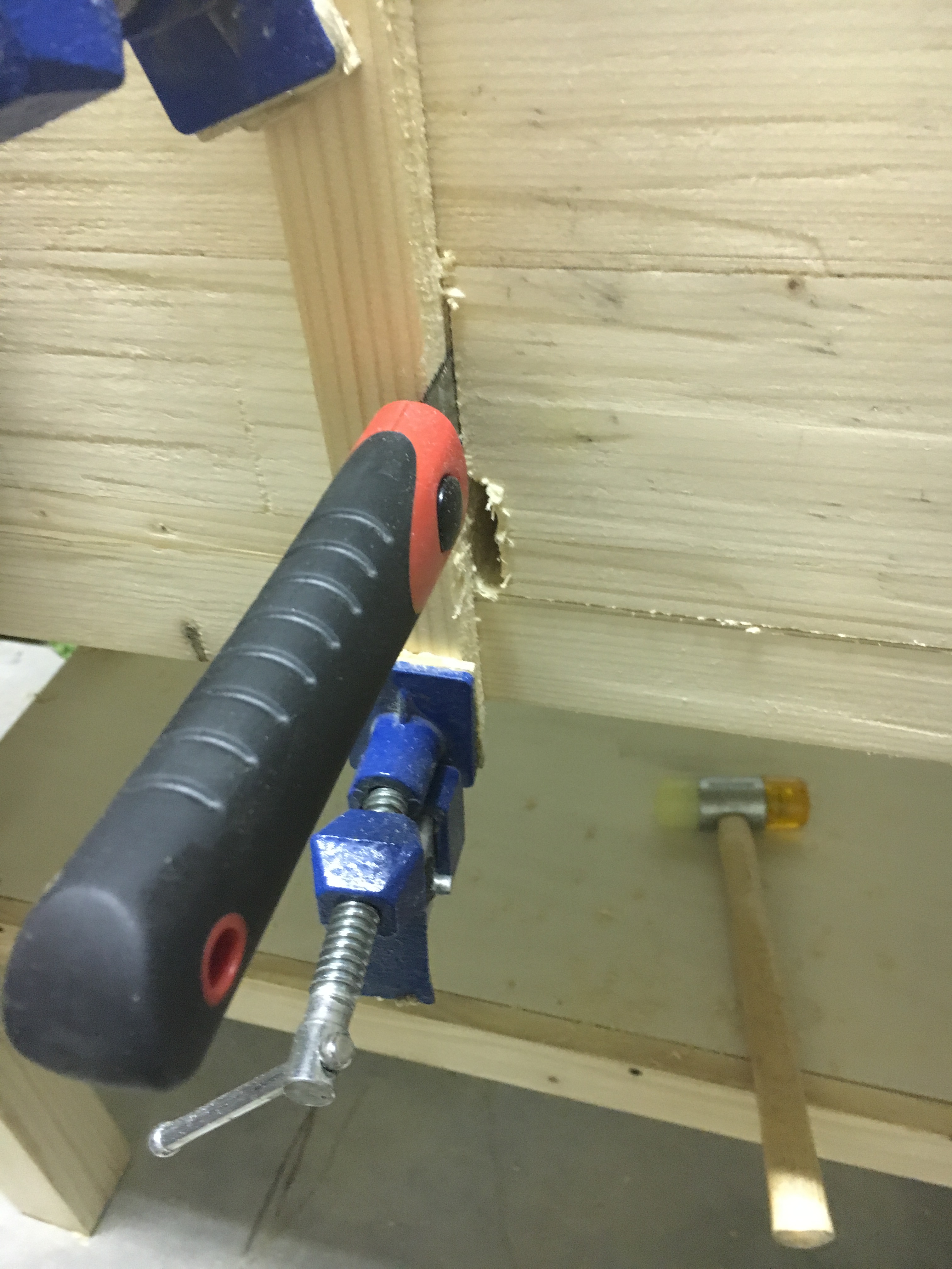 Con l’aiuto di una guida in legno, fissata con dei morsetti, ho dapprima segato con una sega giapponese tutto il perimetro tracciato a matita ricavando così l’apertura frontale del cassetto.