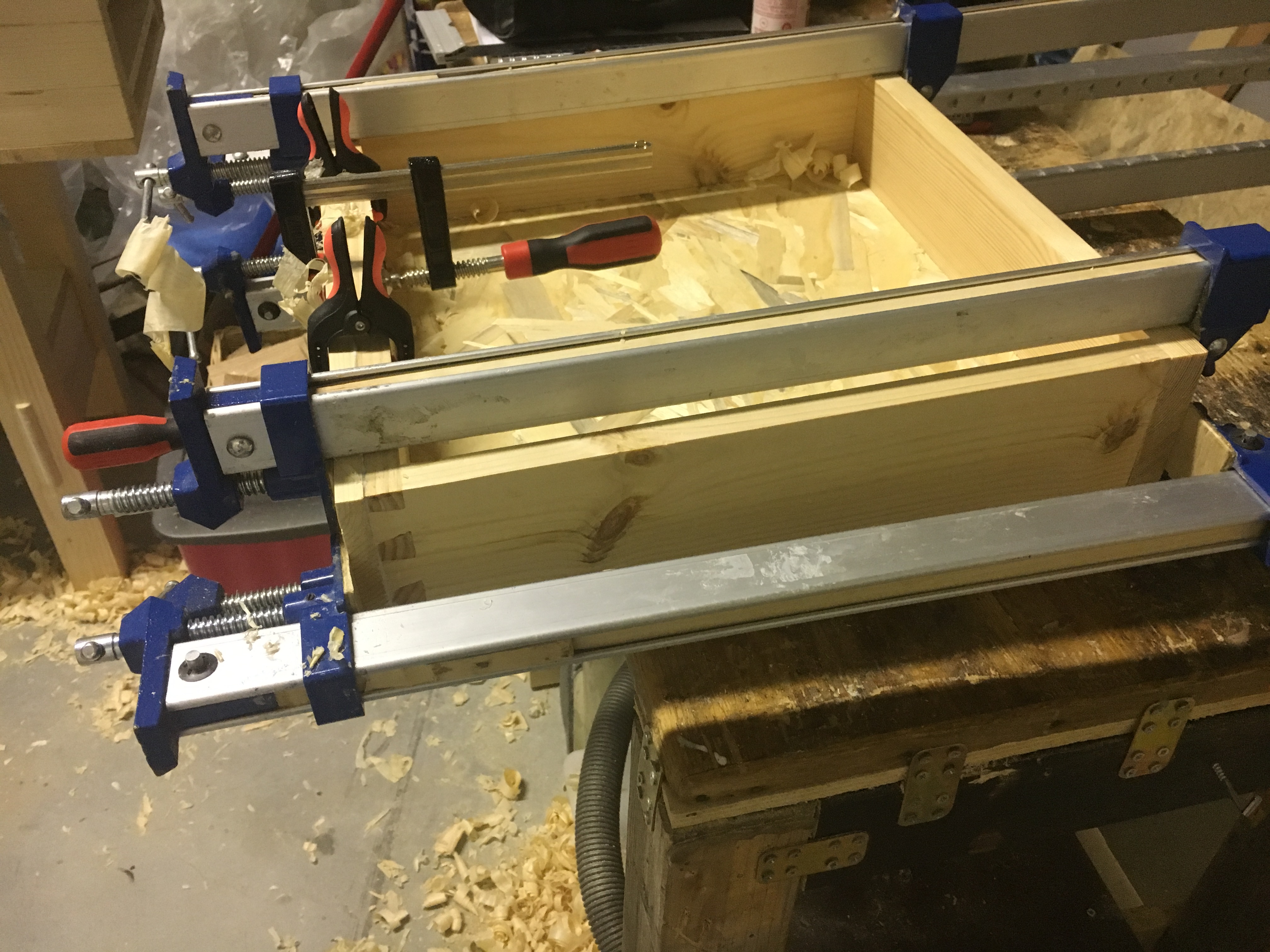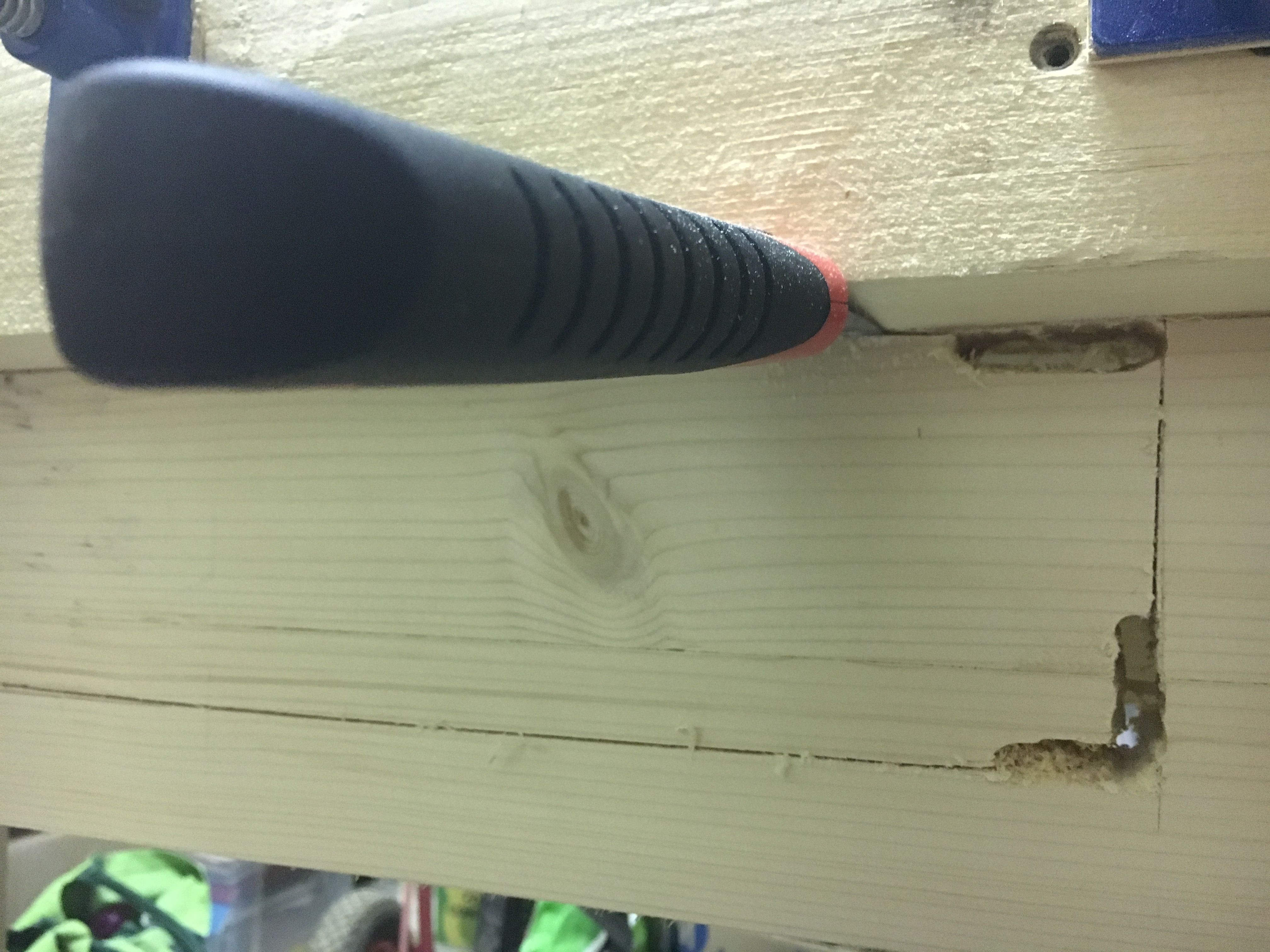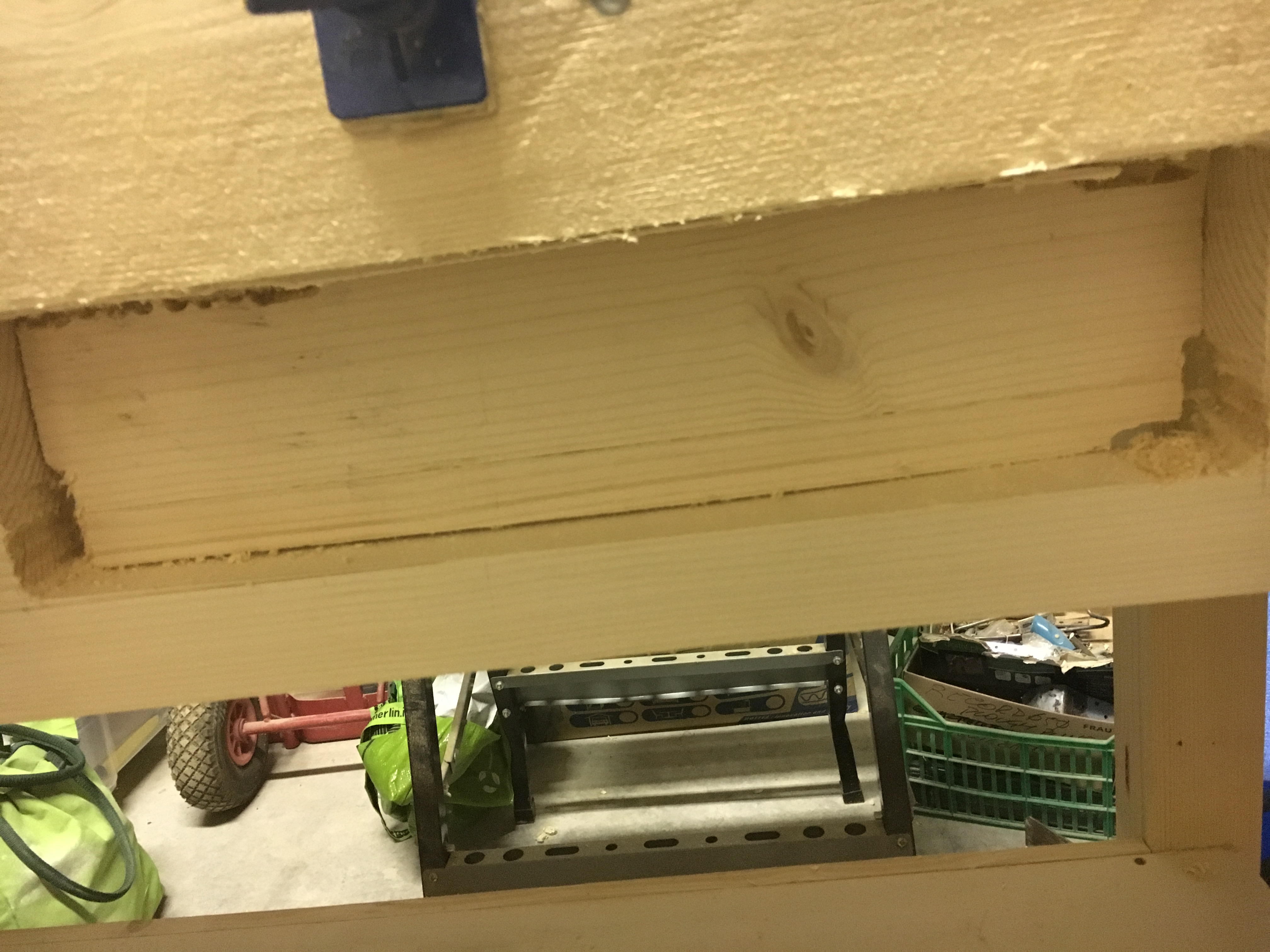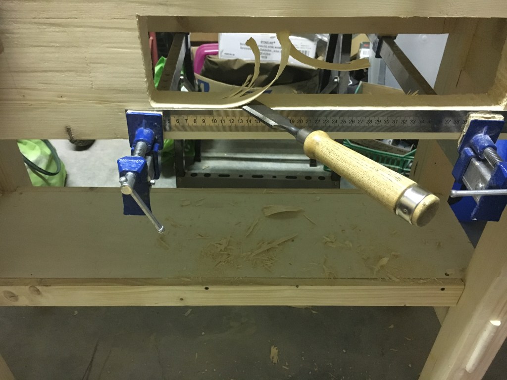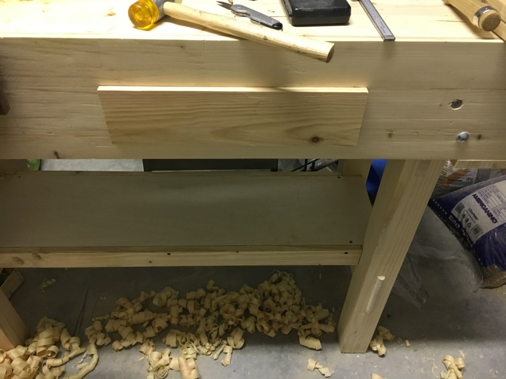 Mi sono avvicinato il più possibile alla traccia utilizzando successivamente scalpelli e raspe. In seguito ho costruito, con incastri a mezzo spessore, la struttura inferiore interna che avrebbe dovuto sostenere tutto il cassetto e le due guide laterali (fissate alla stessa struttura) che impediranno al cassetto di deviare lateralmente. A loro volta la struttura e le guide sono state fissate sotto al banco per mezzo di viti.