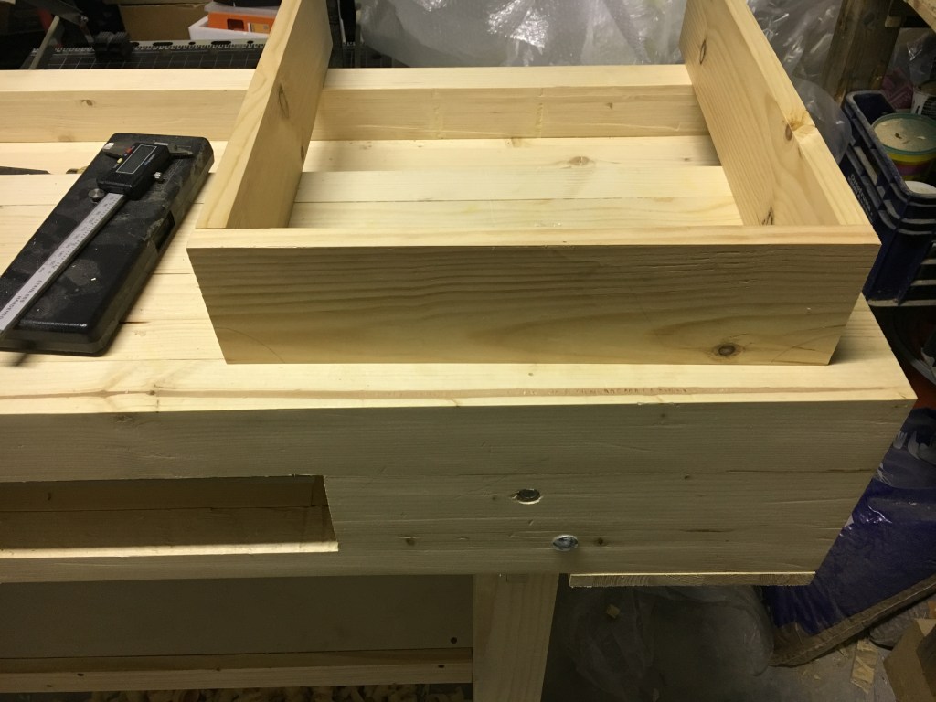 Il pannello posteriore del cassetto è fissato ai laterali con delle viti mentre il fondo del cassetto, in OSB, é stato inserito nella scanalatura ricavata negli elementi del cassetto. Una volta realizzato il cassetto ho piallato il frontale ed i laterali fino a che lo stesso potesse scorrere liberamente e senza intoppi.