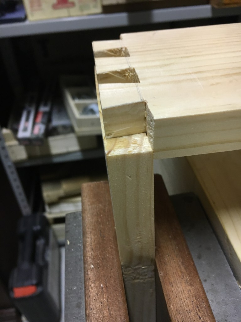 Una volta adattatosi perfettamente, ho tagliato i due pezzi laterali e quello posteriore, tenendo conto per le loro misure anche dello spessore stesso dei pezzi ed ho realizzato quindi gli incastri a coda di rondine solo per il frontale del cassetto.