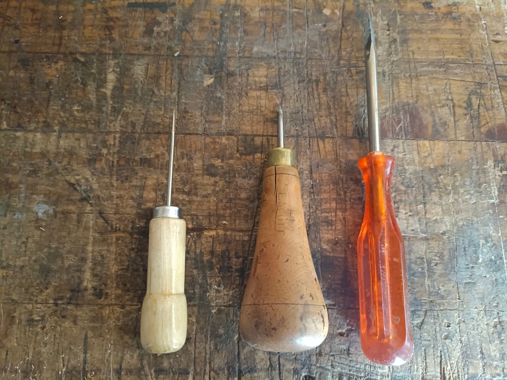 The awl is an extremely simple tool both in form and in its use. It looks like a small screwdriver but its use is completely different. It is used to make small invitation holes in the wood to facilitate the subsequent insertion of screws or other elements. The first use that comes to mind for those who do woodworking by hand is for inserting screws in the hinges, which we talked about in a recent post. Before proceeding with the insertion of the screw, it would always be advisable to mark the exact point where it will be inserted with the awl and then deepen the incision as far as appropriate. Its use is extremely simple and intuitive. Force is applied to the awl while rotating a quarter turn back and forth until an optimal pilot hole is obtained. This type of tool is extremely useful when we need to drill near the head of a piece of wood, an area with a high risk of splitting; drilling a sufficiently deep pilot hole (even using a wood drill bit) will allow you to insert the screw without the risk of splitting the wood. The first awls, let’s say those before 1960, were made only with a wooden handle. Subsequently, the production of awls with plastic handles also began. Today, both types are commercially available. Personally I prefer those with a wooden handle, preferably with a brass ferrule to reinforce the area where the shank is inserted into the handle. There are five types of awl on the market. Round shaft and conical point, round shaft and flat point, square shaft and square point, square and round shaft and pyramidal point. The round shaft awls with conical point (scratch awls) are mainly used in non-carpentry fields such as for example for engraving on leather, plastic and paper but are not very useful in woodworking. Awls with a round shaft and a flat point (bradawl) are not recommended because they wear easily and tend to split the wood. In woodworking, awls with a square or round shaft and a pyramidal or square point are usually used. This type of awl is called square awl or birdcage awl (because they were used in the past to make bird cages). Their square or pyramidal point allows you to make precise pilot holes that do not remove the wood but simply move it. Insisting with the rotary movement and using the shaft of the awl, its shape will make it possible to obtain an invitation hole of the same diameter as the screw, while at the same time obviating the danger of splitting the wood in the areas near the end grain. From time to time it is possible to sharpen both the sides of the shaft and the point of the awl with an iron file. Ultimately a tool certainly little known and used today but indispensable in woodworking by hand.