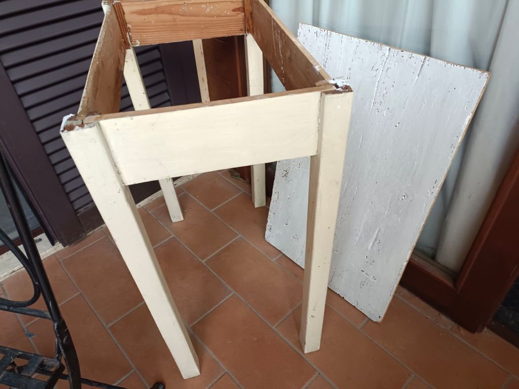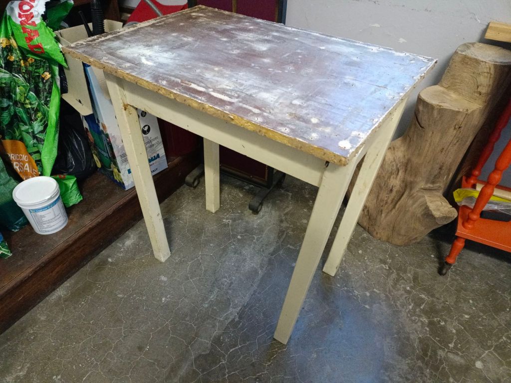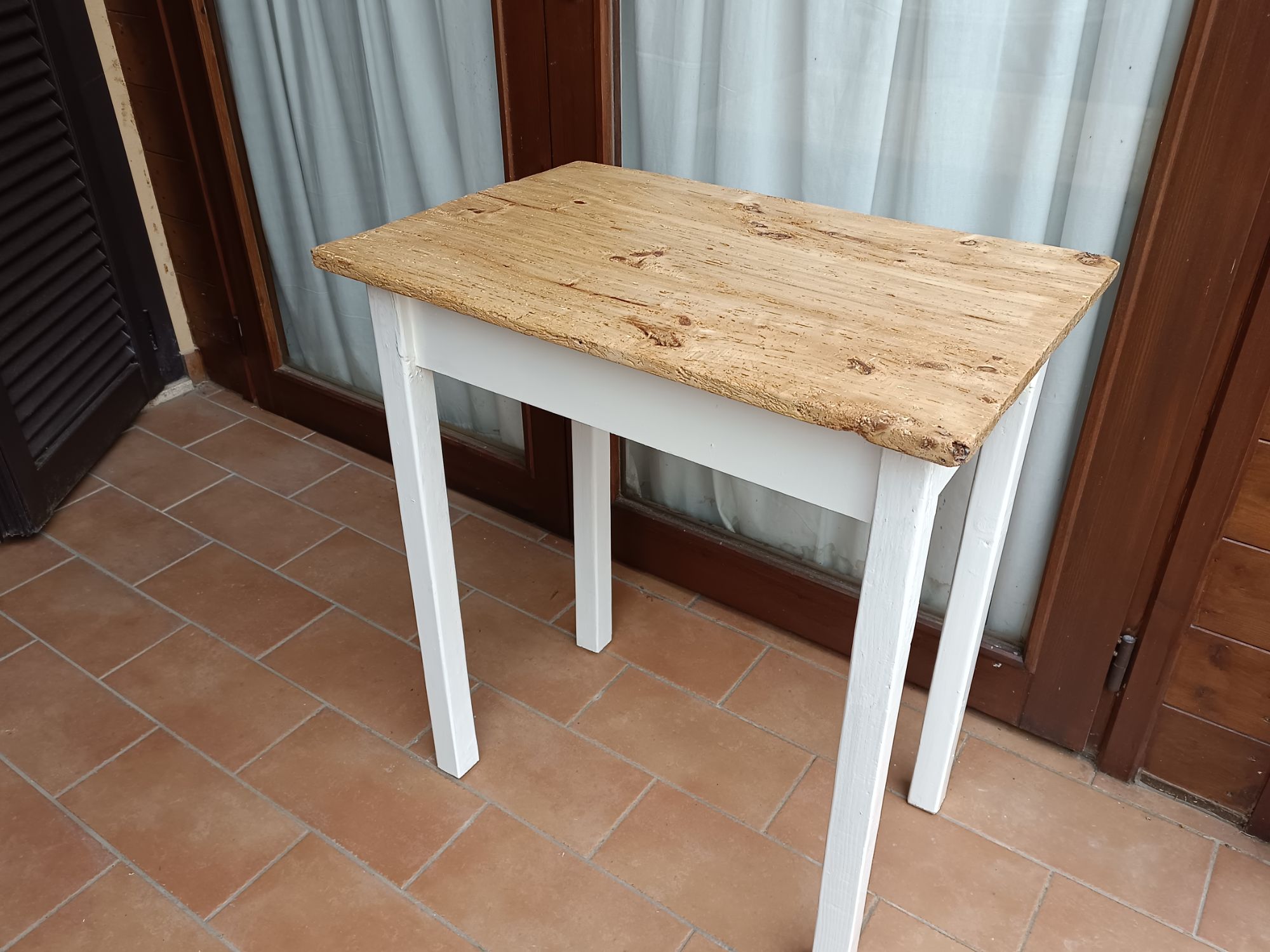 Per quanto riguarda il piano del tavolo, terminato il trattamento antitarlo, ho piallato leggermente e proceduto a levigare con carta abrasiva fino alla 400 per poi finire applicando la solita finitura satinata protettiva della GORI. Sulla struttura del tavolo ho applicato due mani di smalto color bianco e inserito dei feltrini ai piedi. Ho infine riassemblato la struttura al piano, inserendo al di sotto del tavolino delle staffette a L. Il tavolinetto era molto particolare per la sua forma, piccolo, stretto e con gambe alte ed è valsa la pena procedere a sistemarlo.