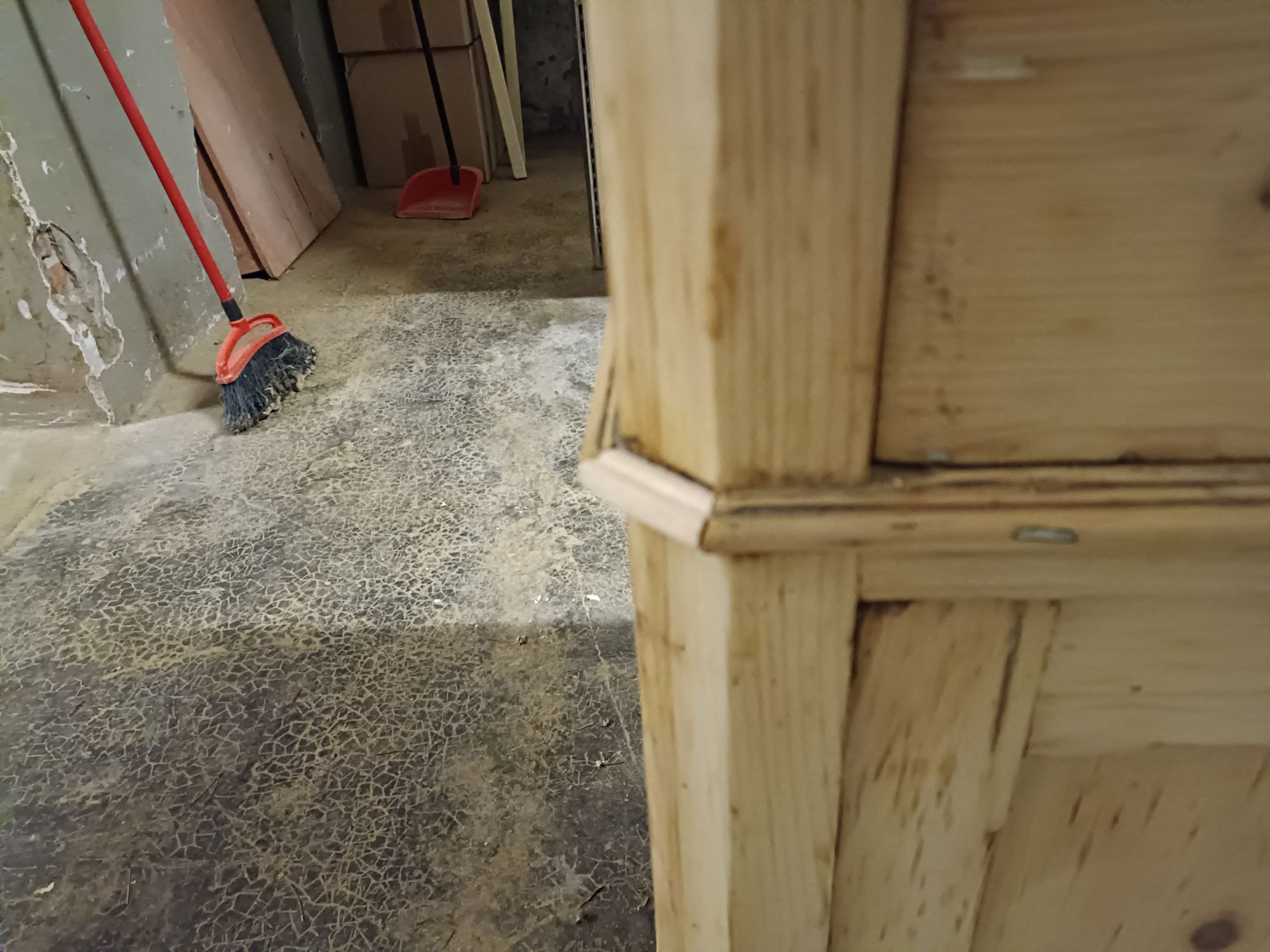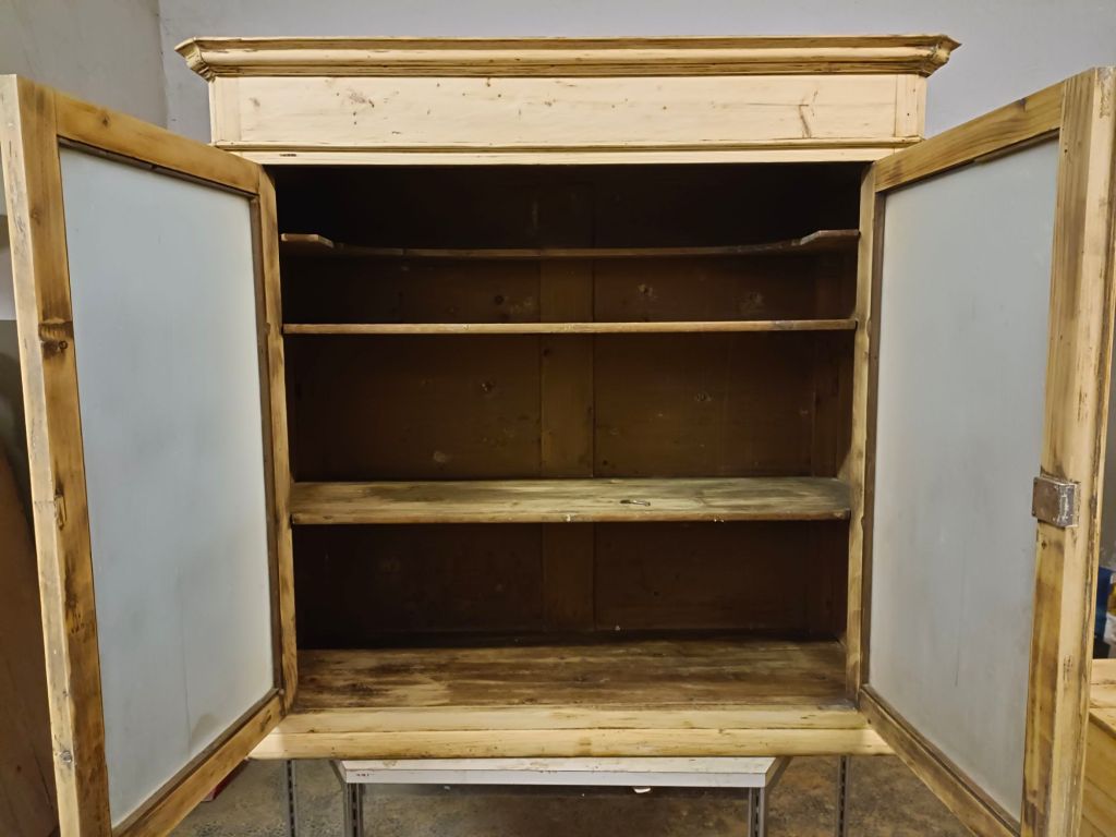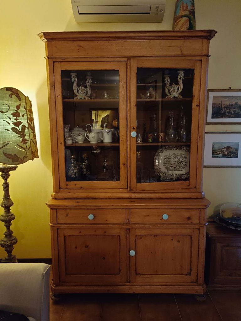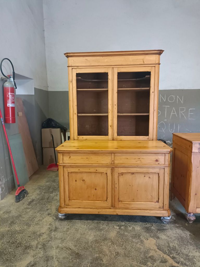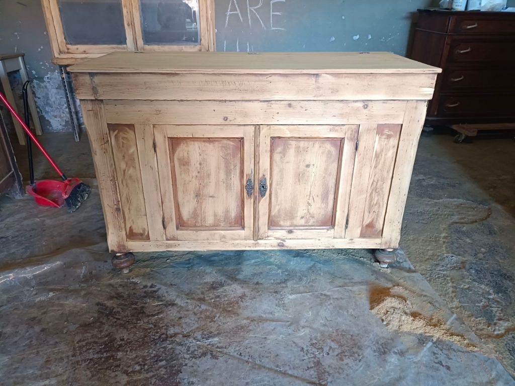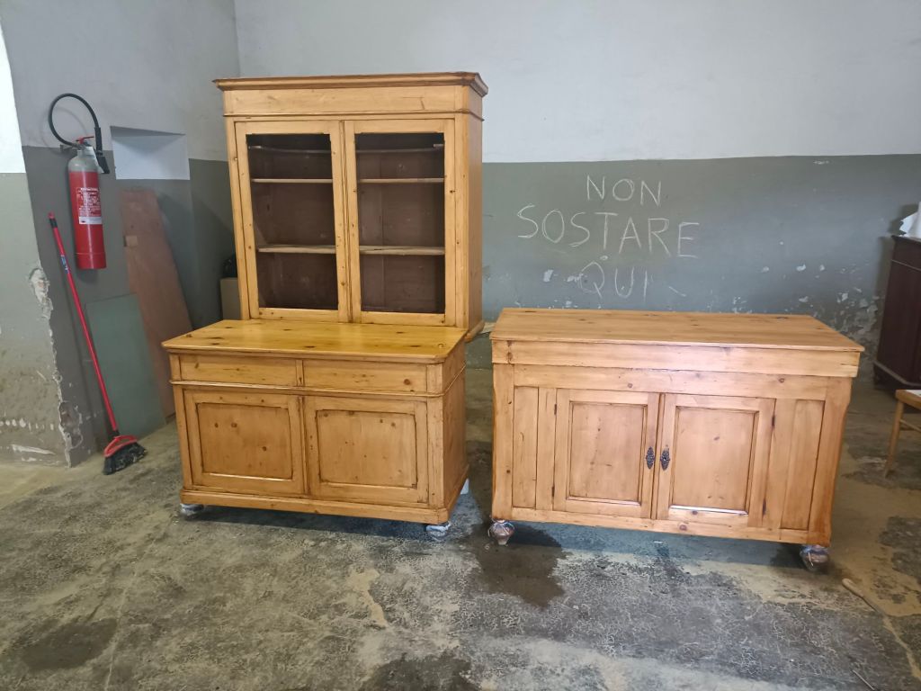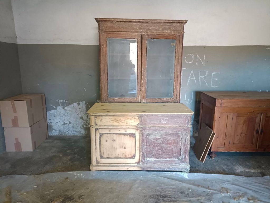 Durante la lavorazione non sono mancate alcune riparazioni. Un ripiano della vetrina era mancante di un sostegno, che ho inserito. La base della credenza mancava di un pezzetto di modanatura che ho ricostruito, cercando di riprodurne la forma. La modanatura superiore si stava staccando in più punti e allora, dove é bastato, sono intervenuto con la colla e dove non sufficiente ho rinforzato la struttura con dei listelli di legno non visibili esternamente. I piedi a cipolla della credenza erano di altro legno, più duro, ed erano tarlati. Ho passato l’antitarlo e sigillato in sacchetti di plastica per due settimane. I listelli della base interna della credenza erano schiodati ed ho preferito rimetterli in sede con l’ausilio delle viti.