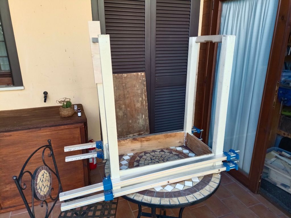 Le gambe erano unite alle traverse con incastri tenone e mortasa e rinforzate nell’unione con dei chiodi, alcuni dei quali fuoriusciti dal legno. Ho quindi rimosso dapprima i chiodi sporgenti e poi incollato di nuovo gli incastri delle gambe. Ho morsettato tutta la struttura rinforzando internamente l’unione, inserendo delle staffette a L. Durante questa fase ho inserito dei distanziatori per mantenere divaricate e alla giusta distanza le gambe del tavolo. Successivamente ho stuccato con stucco per legno bianco le parti che si erano scheggiate.