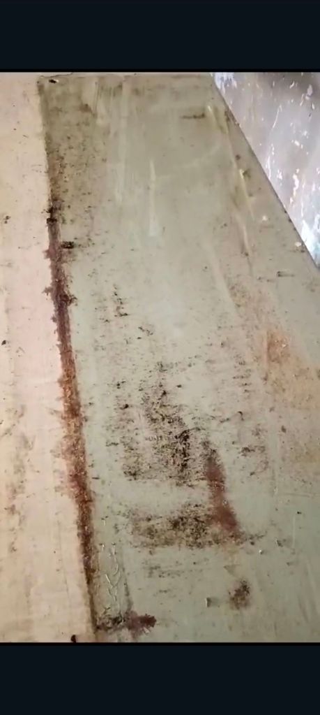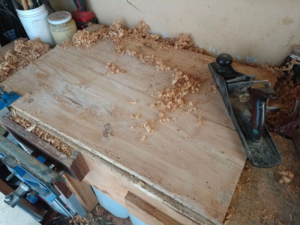 L’idea era quella di ottenere un legno il più chiaro possibile. Per farlo, una volta levigata tutta la superficie, ho utilizzato una miscela di acqua ossigenata a 130 volumi, fatta preparare in farmacia, diluita in poca ammoniaca, circa il 5%, e spennellato abbondantemente tutta la superficie, ripetendo il trattamento un paio di volte. Il risultato è stato buono, il legno si è schiarito molto, virando decisamente al bianco.