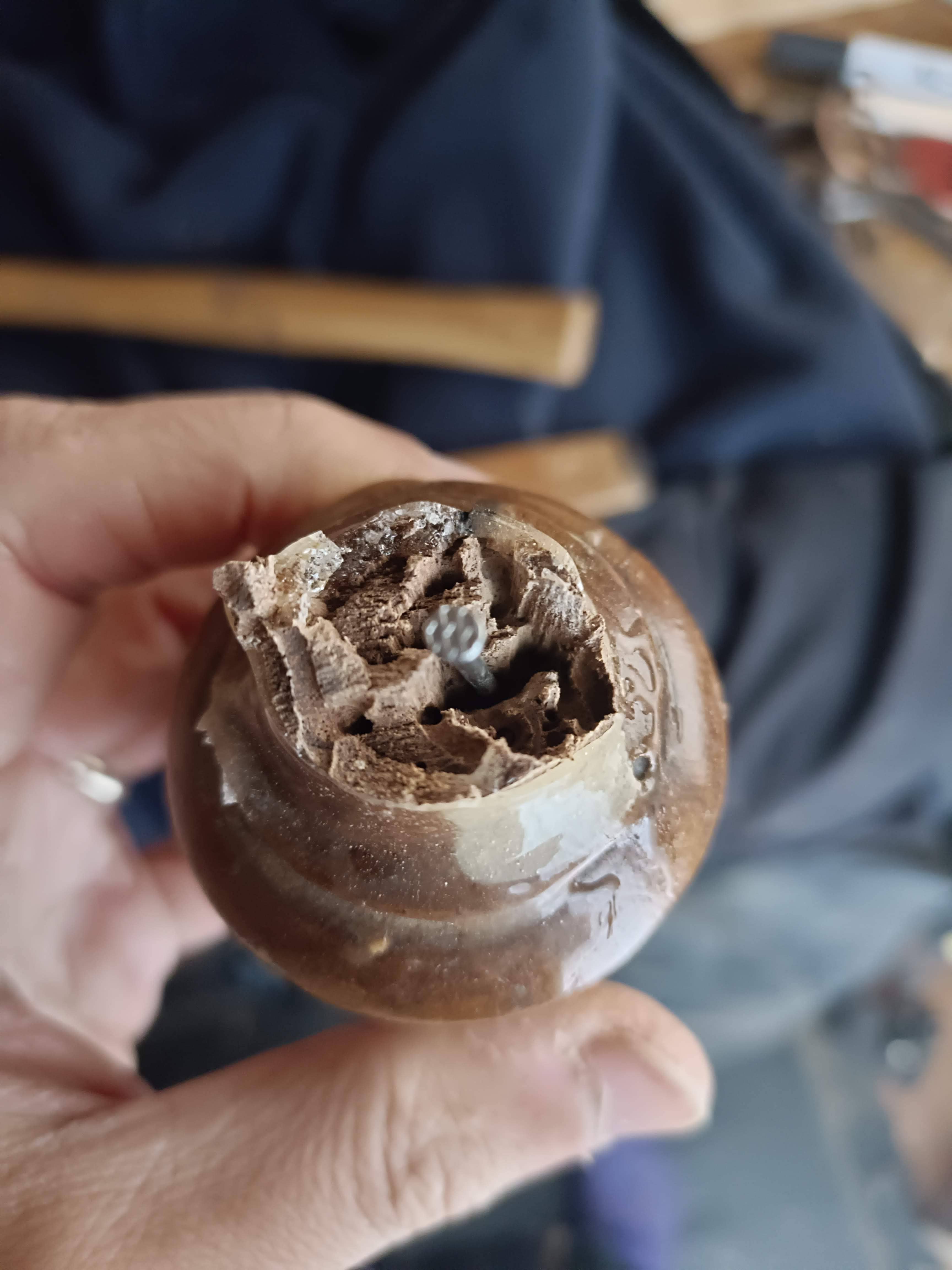 Ho posto la sedia ribaltata su un piano stabile ed ho inserito un chiodo di circa 4 cm. battendolo con il martello al centro della sezione superiore della gamba. Questa è sicuramente la fase più difficile in quanto la gamba si presentava in pessime condizioni internamente e non è stato semplice centrare perfettamente il chiodo. Ho inserito il chiodo per circa 2 cm. di profondità.