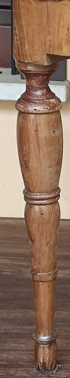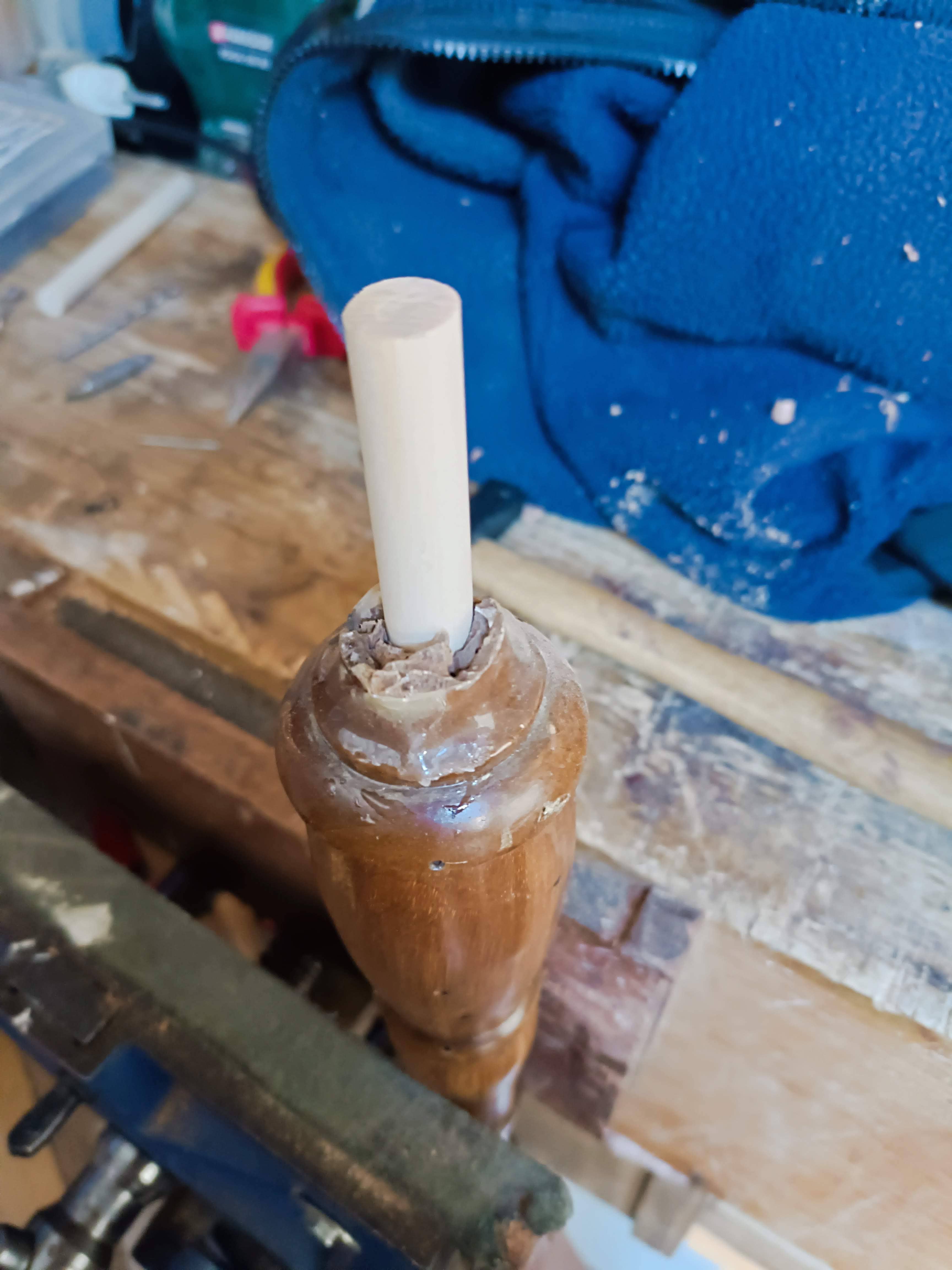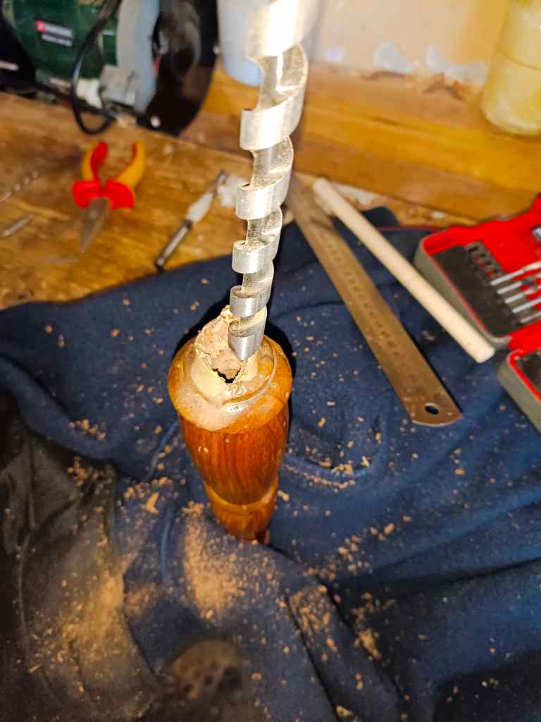 Dopo il trattamento antitarlo sono passato alla riparazione vera e propria che consiste nell’inserimento di un perno in legno (detto anche caviglia) all’interno di due fori praticati su ambo le parti della gamba e all’applicazione di colla vinilica. Vediamo come.