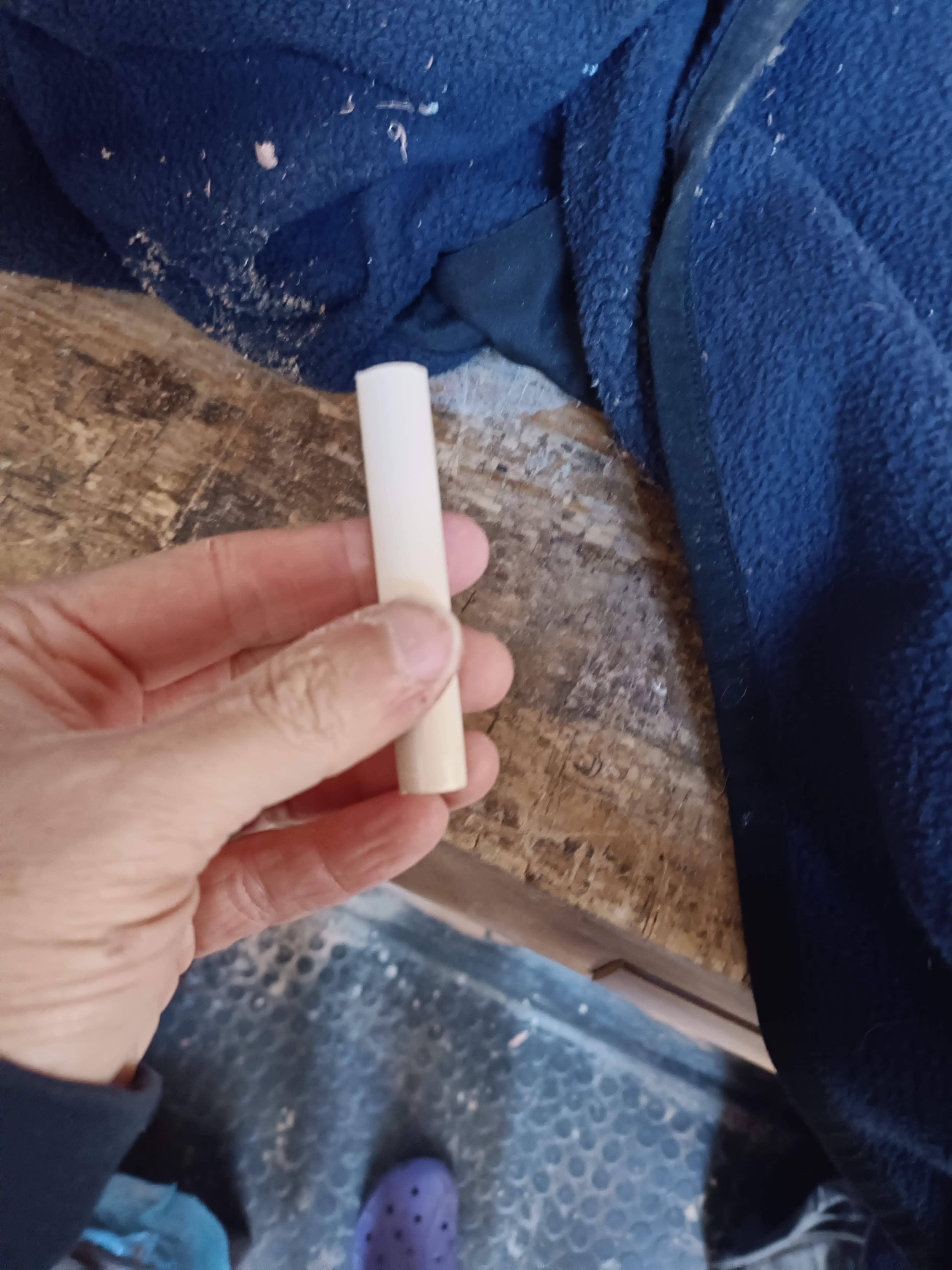 Il perno dovrebbe avere un diametro di circa 1/3 rispetto al diametro della gamba ed essere di un legno duro, nel mio caso pioppo, ed essere inferiore rispetto alla lunghezza dei fori praticati di un paio di millimetri. Nel mio caso i fori erano di 3,5 cm. per sezione e quindi ho impiegato un perno di 6,8 cm. di lunghezza.