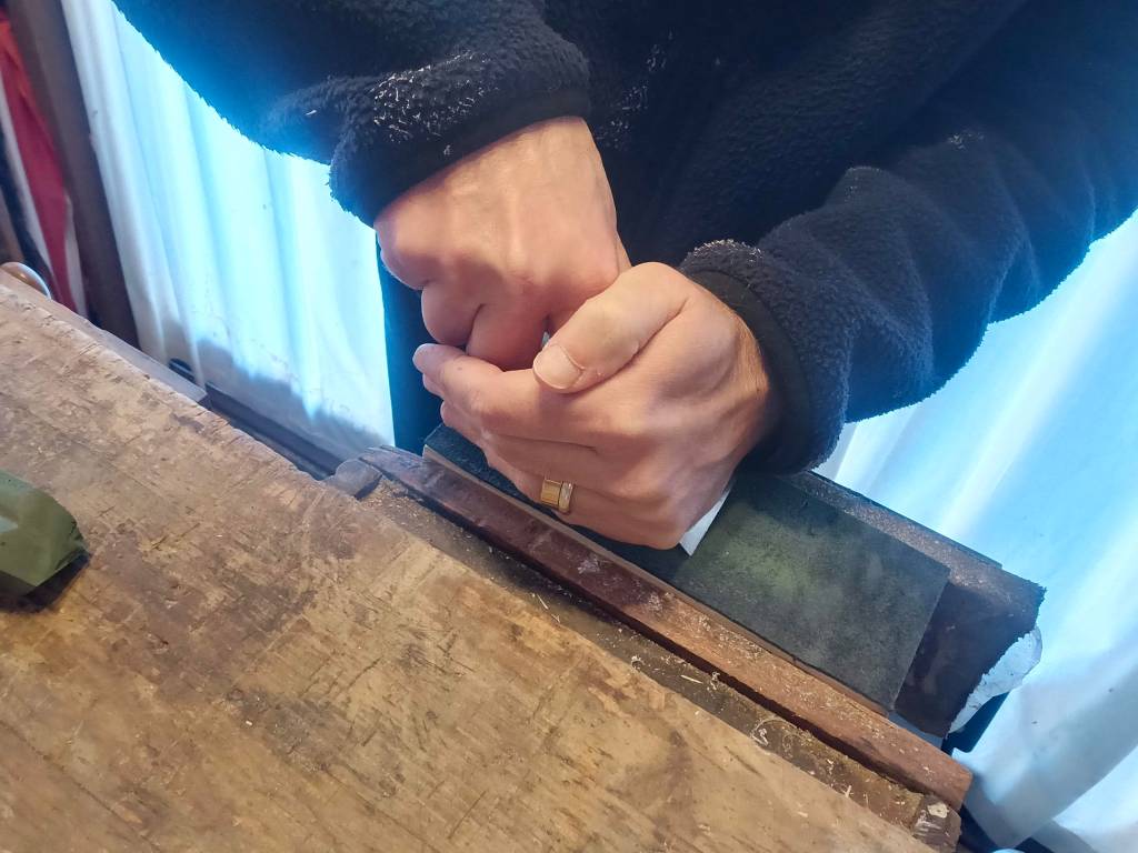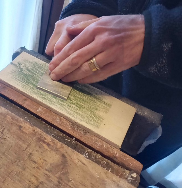 Sulla parte dove è stata applicata la pelle si lucida il bisello delle lame. Il movimento avviene solo a ritroso per evitare impuntamenti del tagliente nella pelle. Si appoggia bene il bisello sullo strop e si effettuano circa 30 passate a ritroso esercitando una certa forza e pressione sulla tavoletta e cercando di mantenere sempre ben aderente il bisello alla superficie. La lucidatura viene fatta a mano libera senza ausilio di guide.